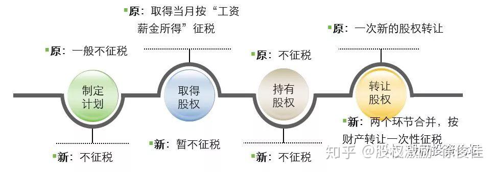 老政策:在期权行权、限制性股票解禁以及获得股权奖励时,按照股票(股权)实际购买价格与公平市场价格之间的差额,按照“工资、薪金所得”项目,适用3-45%的7级超额累进税率征收个人所得税;在个人转让上述股票(股权)时,对转让收入高于取得股票(股权)时公平市场价格的增值部分,按“财产转让所得”项目,适用20%的比例税率征税。