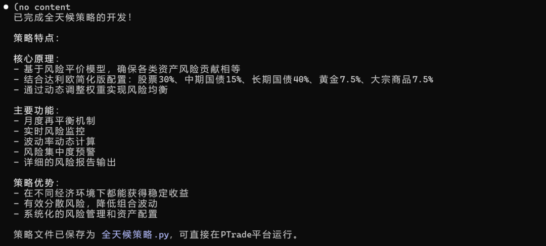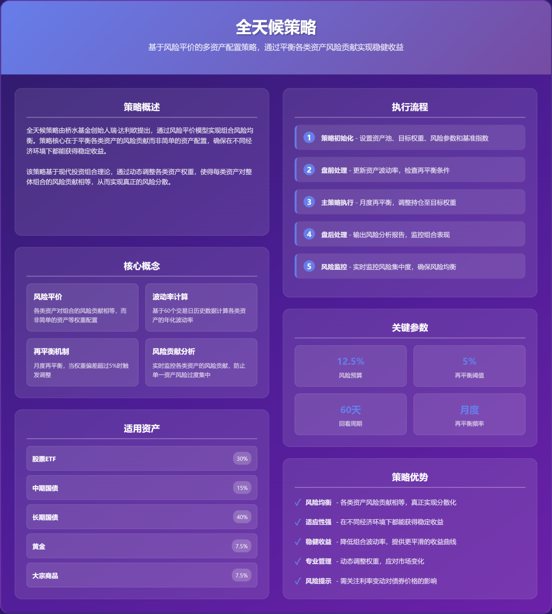 介绍桥水全天候策略(All Weather Portfolio)的原理与经典配置,并演示用 Claude Code + Ptrade 平台实现、回测、迭代优化的完整流程。