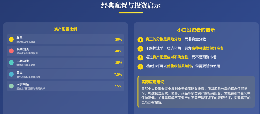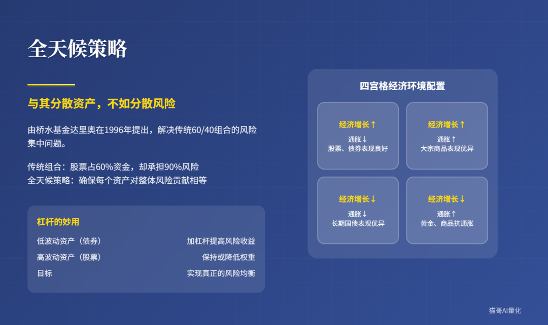 将经济环境分为四种情况(经济增长↑↓ × 通胀↑↓),在不同环境下配置各自占优的资产,确保无论经济如何变化,总有一部分资产表现良好。